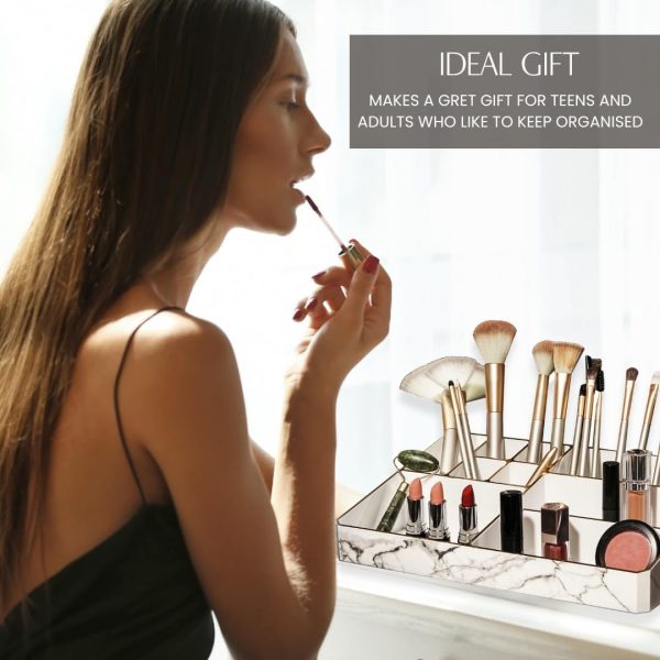 Upgrade your beauty space with our 9 Compartment Marble Look Makeup Organiser, a stylish and functional solution for storing your daily essentials. Crafted from durable, waterproof PS material, this elegant makeup organiser features a modern white marble finish with a chic rose gold trim, adding a touch of luxury to your vanity or dressing table.